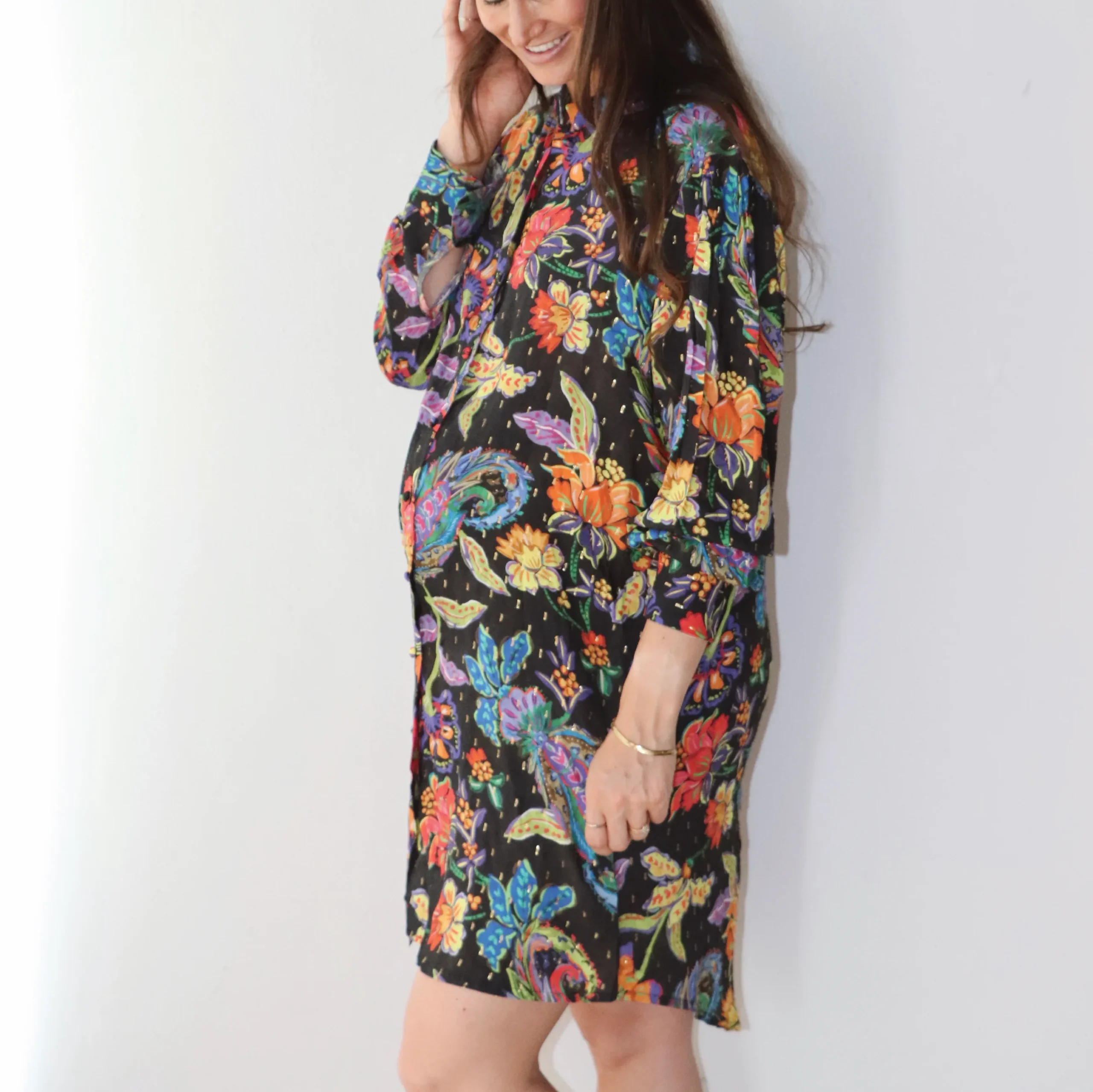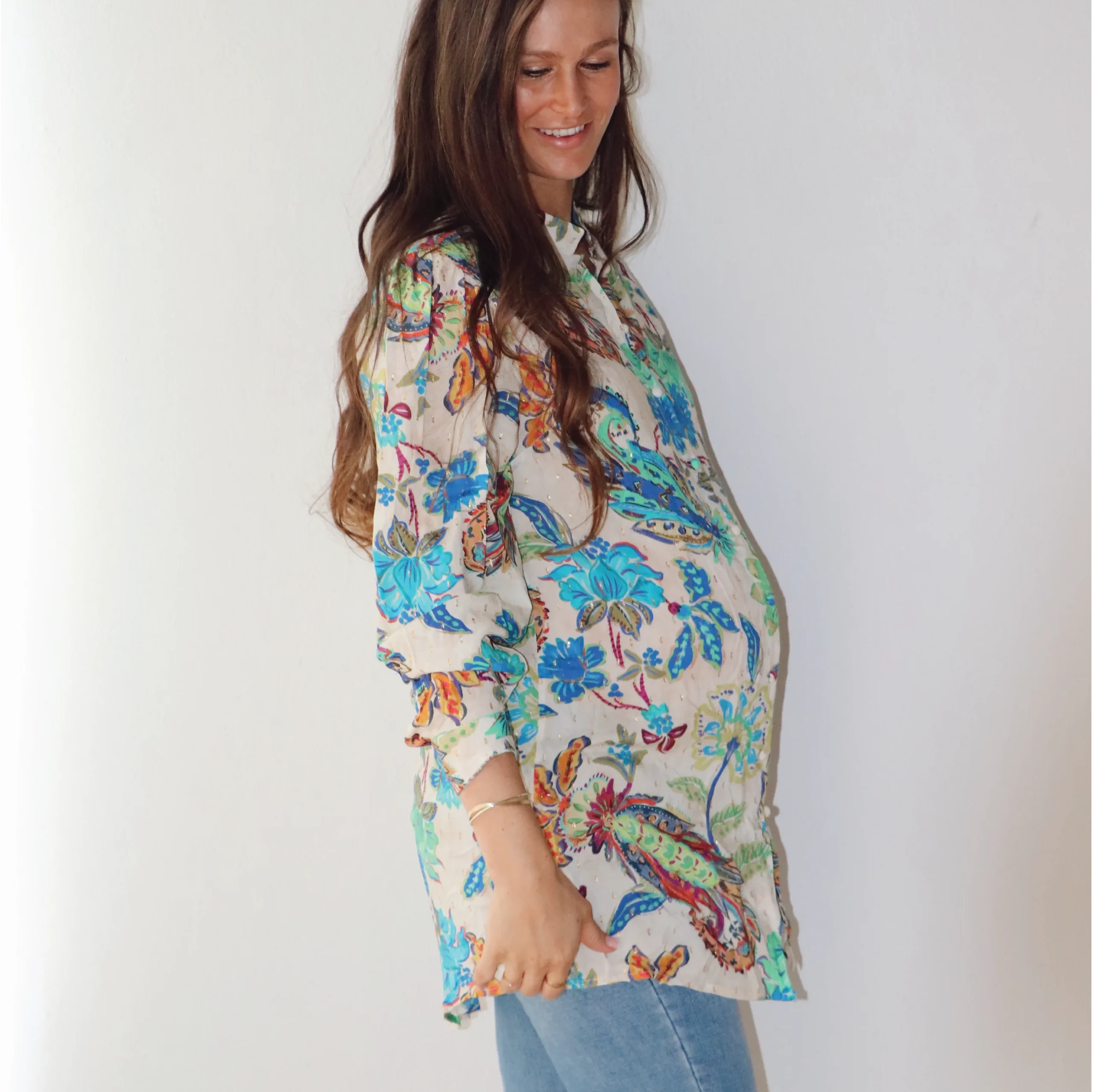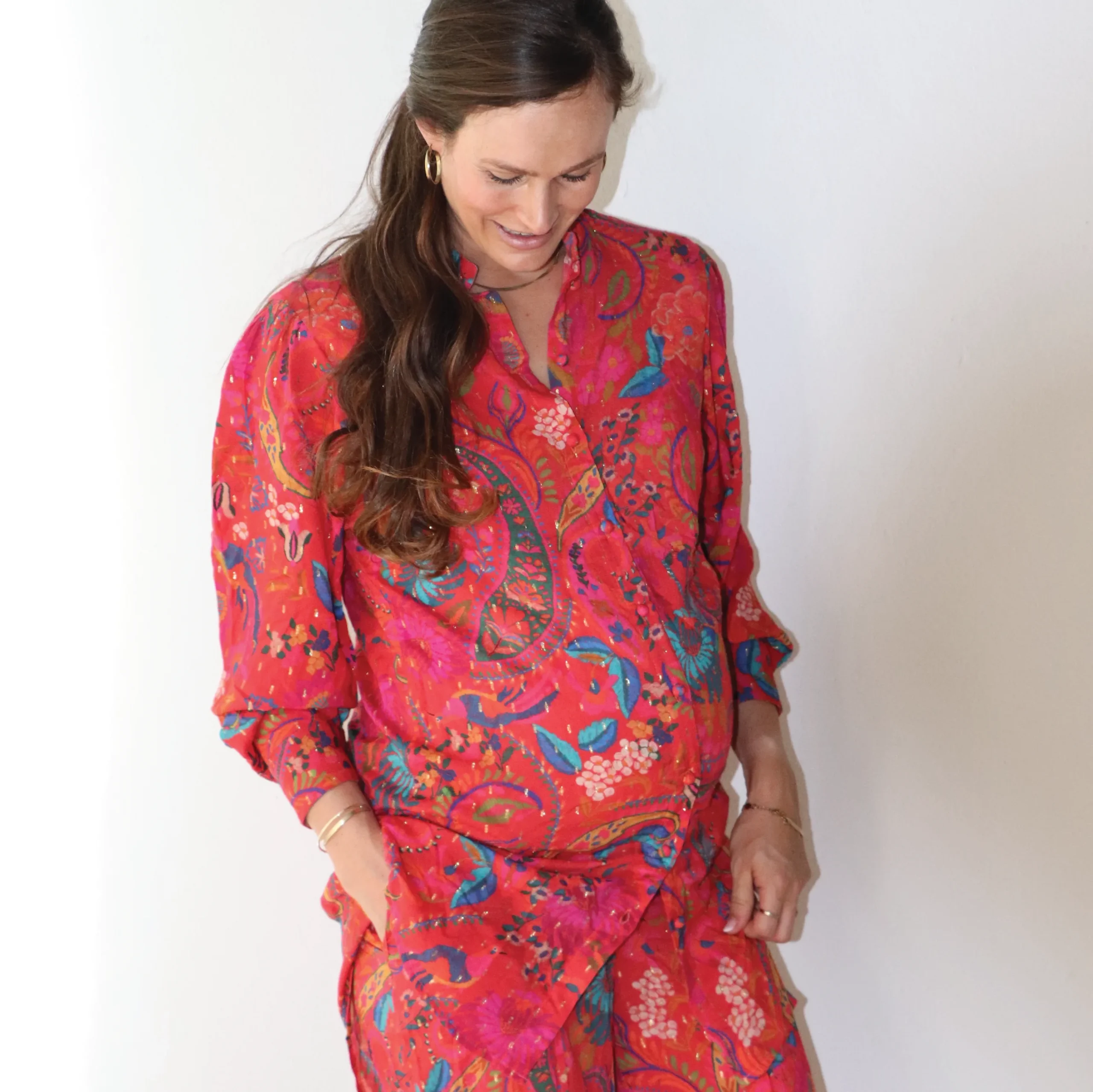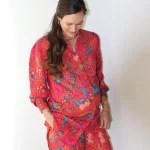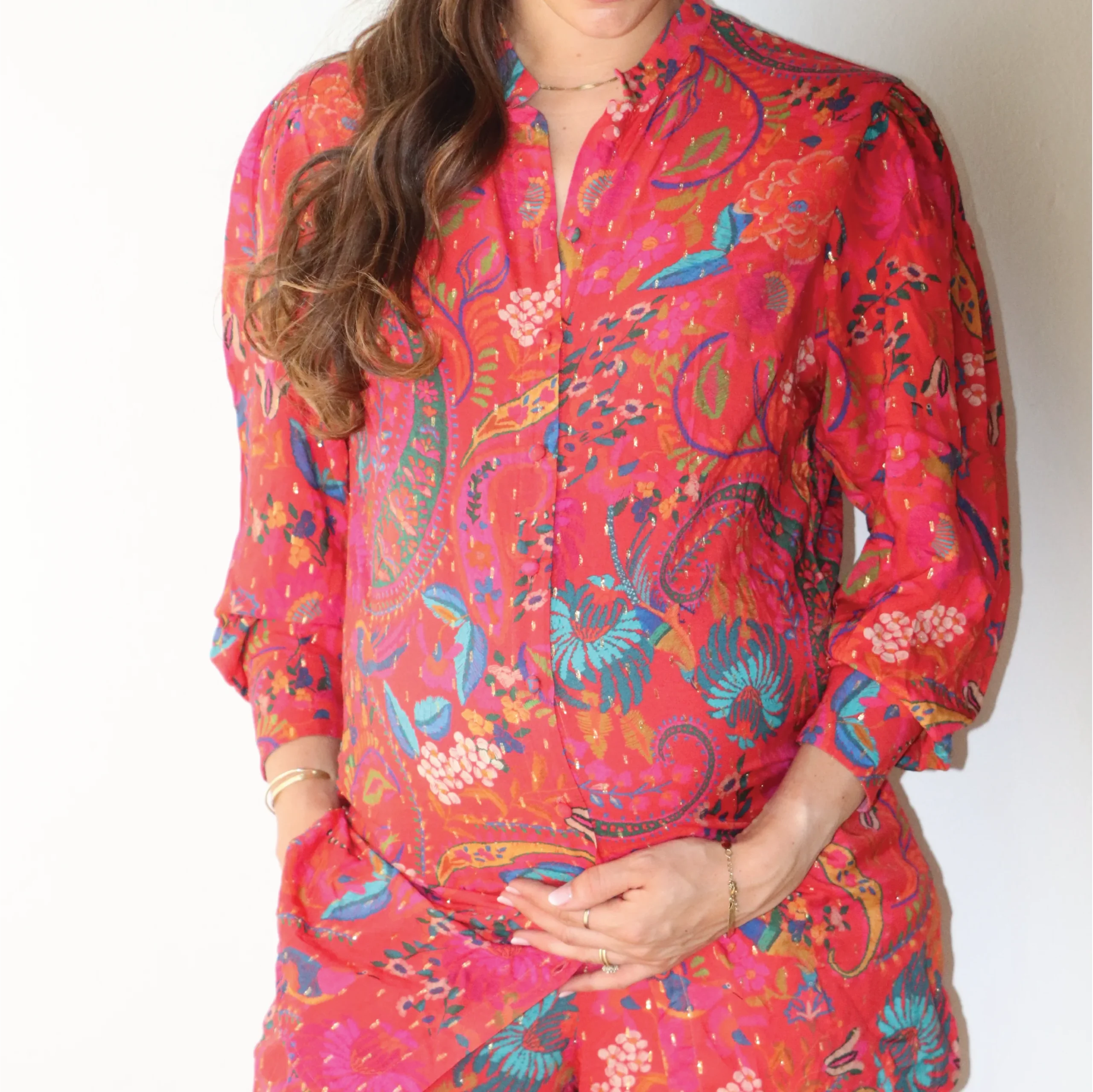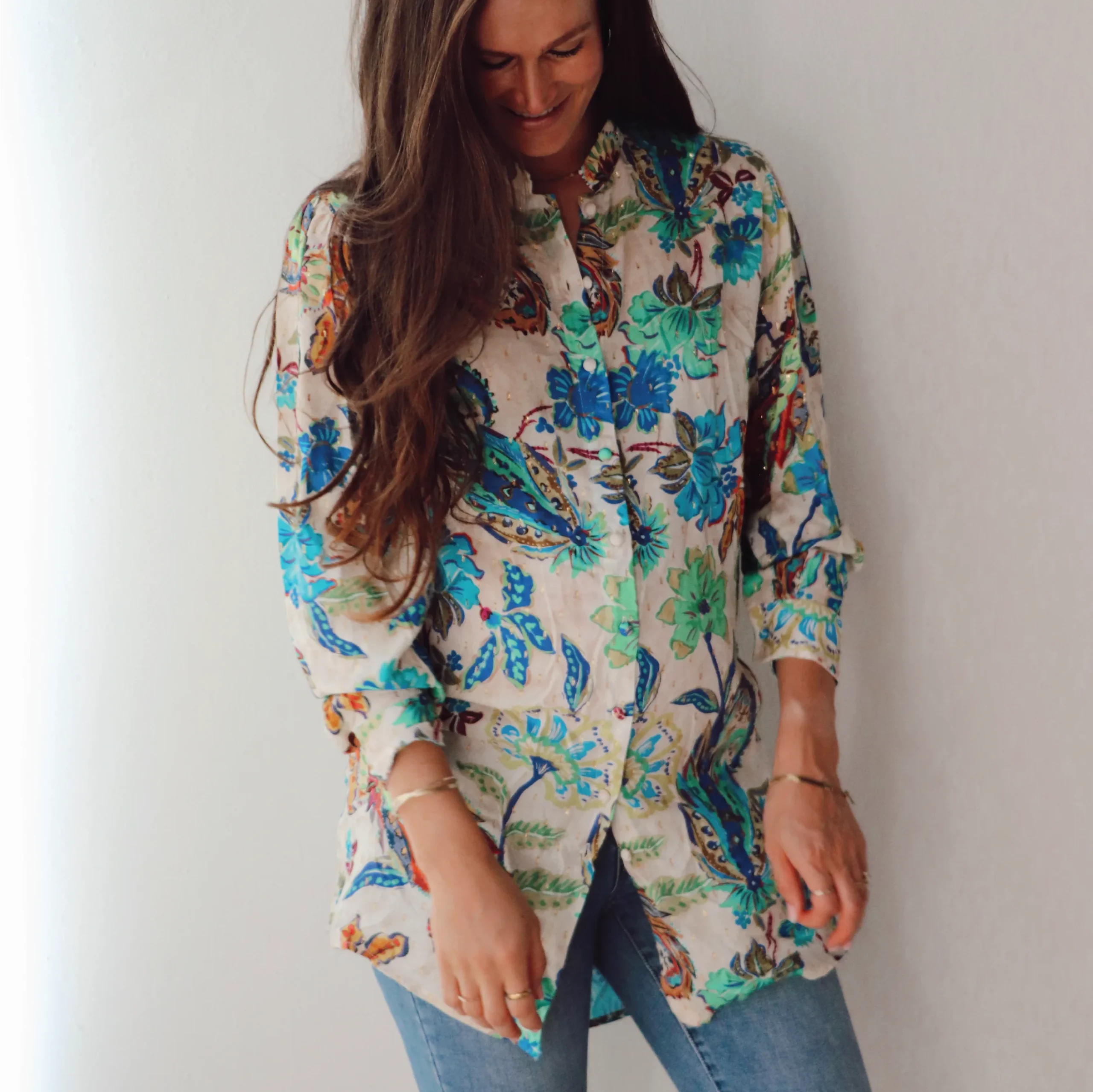 Our Mandarin blouse blends structure and ease in all the right ways. Designed with a pretty mandarin collar, long sleeves with cuffs, and detailed covered buttons in front. This elongated fit is perfect for wearing over pants, skinny jeans, or leggings for extra coverage — or even styled as a dress. Wear it buttoned up for a polished look, or open over a cami for relaxed layering. A timeless piece with a modern twist.